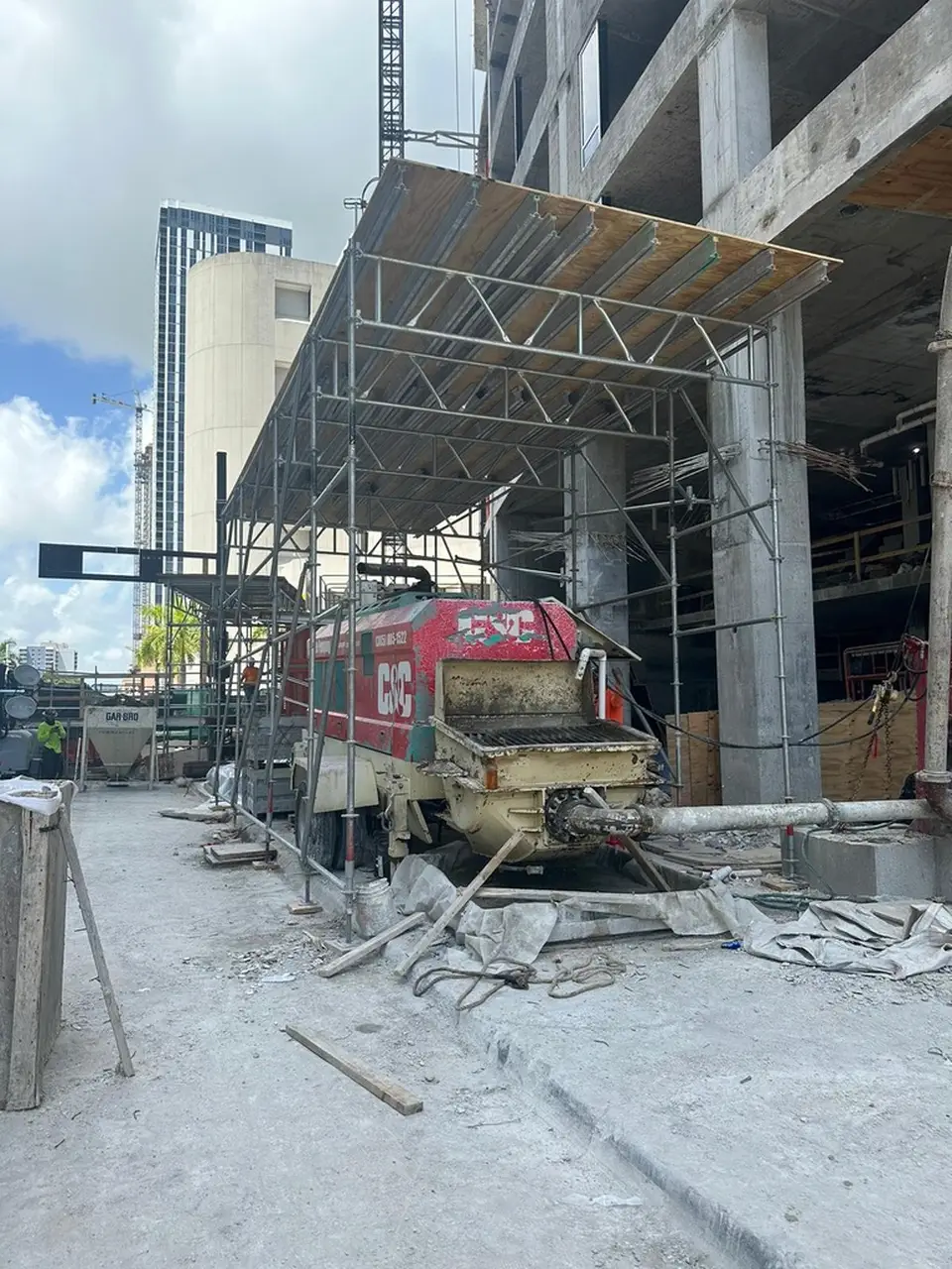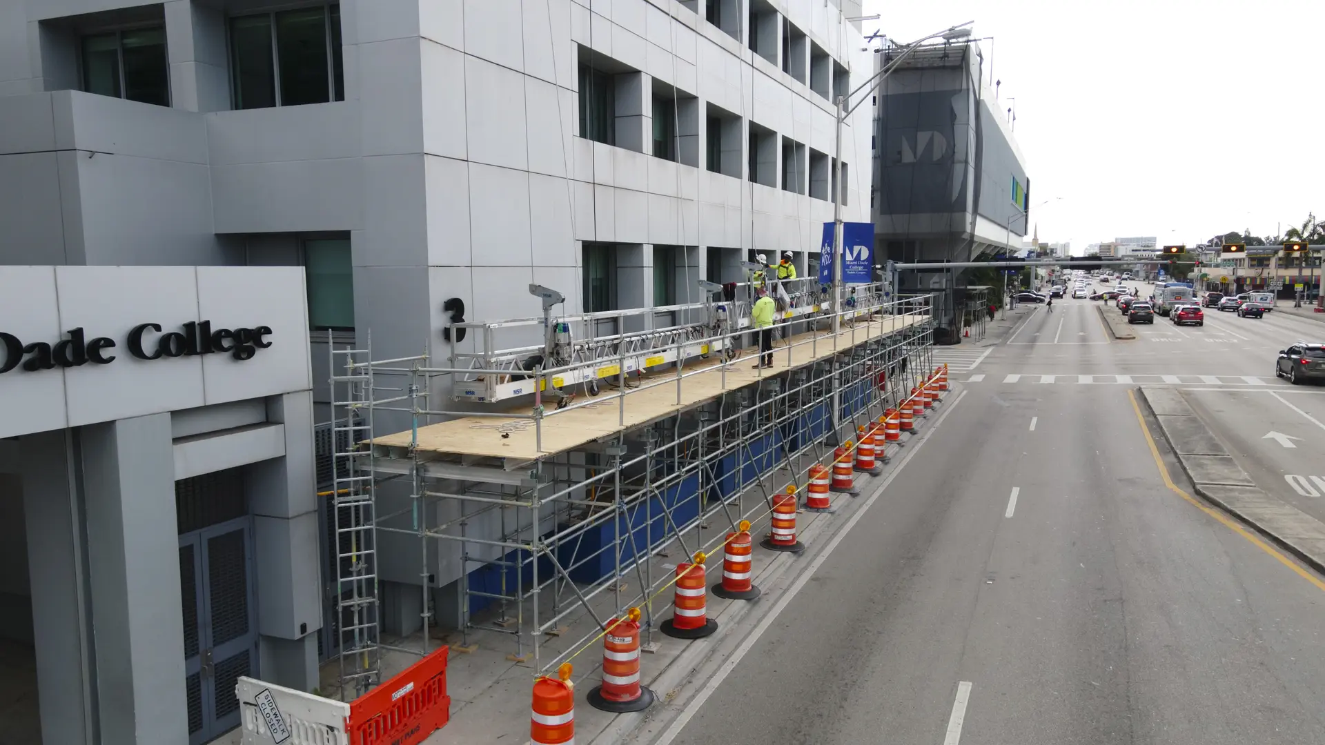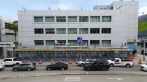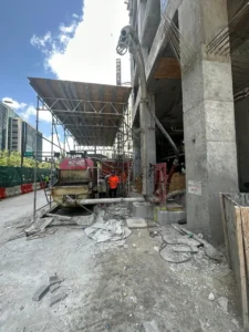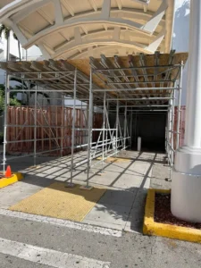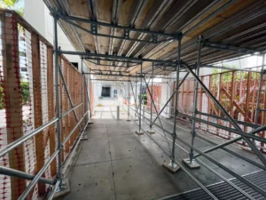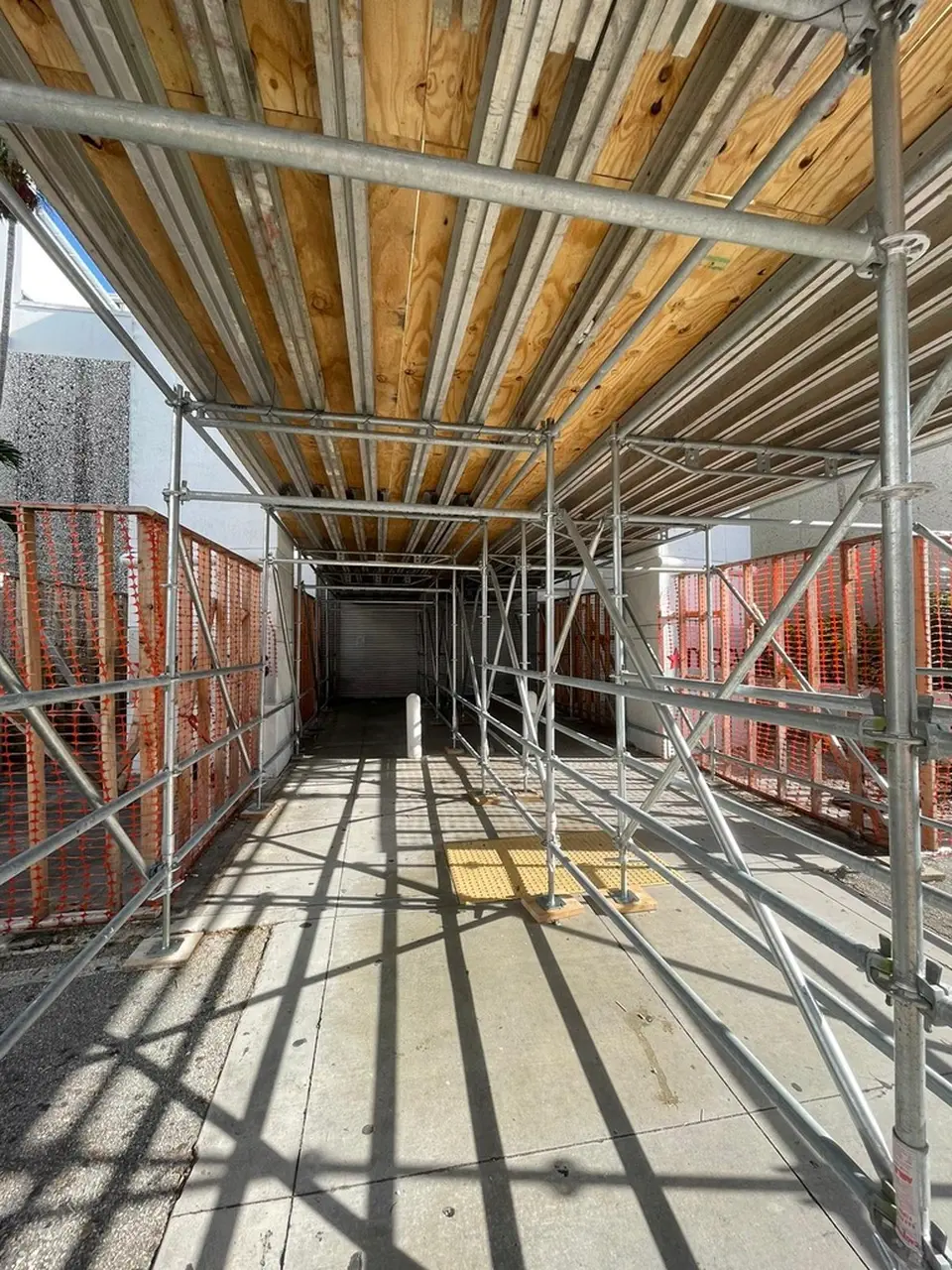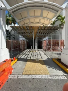 A Sidewalk Canopy, is a temporary overhead protection system installed over pedestrian walkways next to construction or renovation sites. Its primary function is to ensure public safety by shielding pedestrians from potential falling debris, tools, or construction materials.
